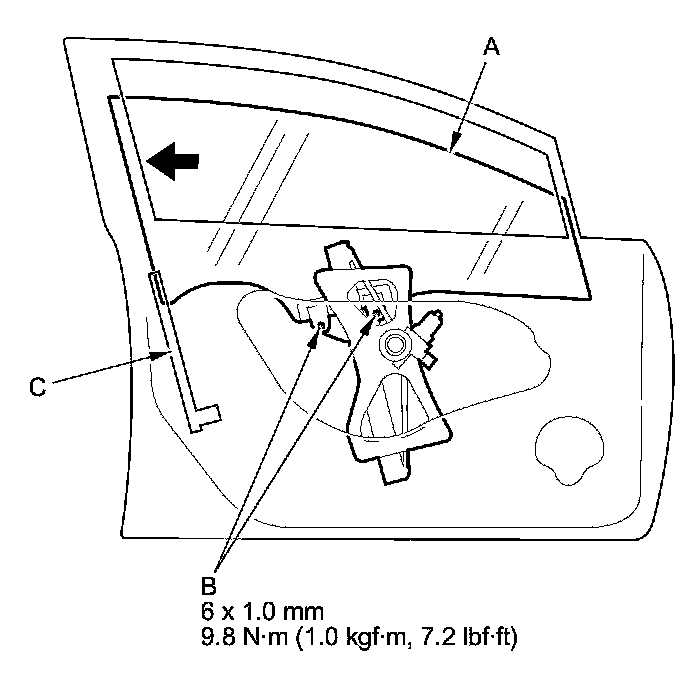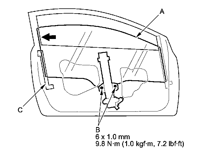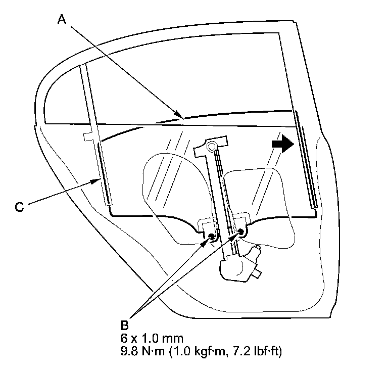 4. Push the glass against the glass run channel (C), then tighten the glass mounting bolts.