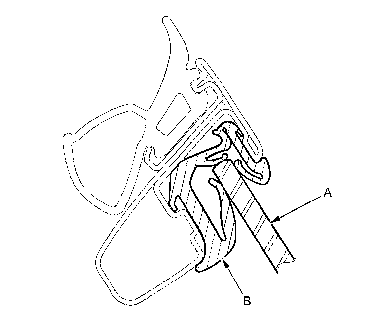 6. Raise the glass fully, and check for gaps. Also make sure that the glass (A) contacts the glass run channel (B) evenly.
