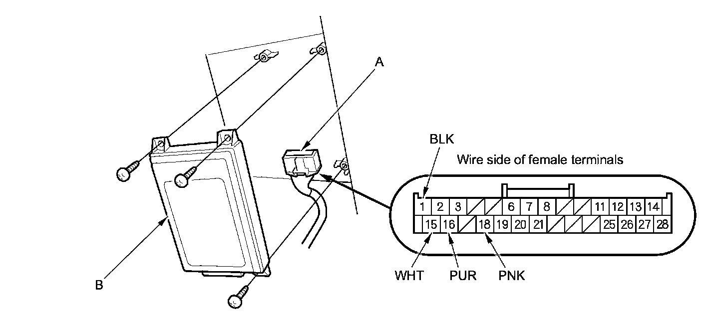 3. Disconnect the 28P connector (A) from the HandsFreeLink control unit (B).