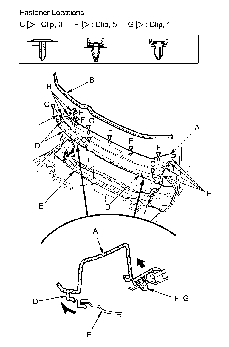 3. Release the hooks (D) from the edge of the under-cowl panel (E).