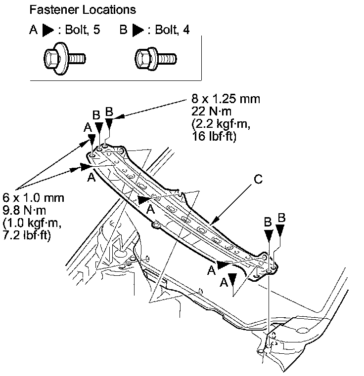 4. If necessary, remove the bolts (A, B), then remove the under-cowl panel (C).