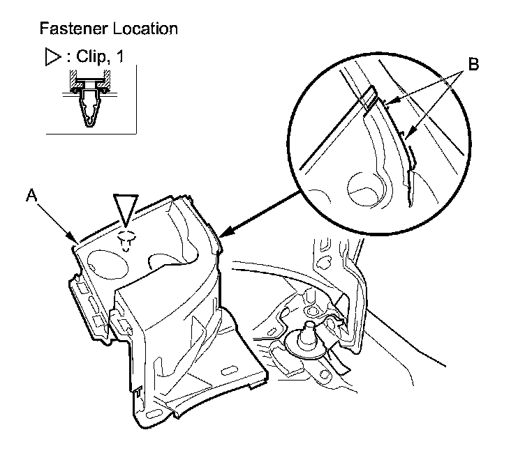 6. Detach the clip by carefully pulling up the side cowl cover (A), then remove the cover by releasing the hooks (B) from the front fender. Repeat this step for the other side cowl cover, and disconnect the windshield washer tube.