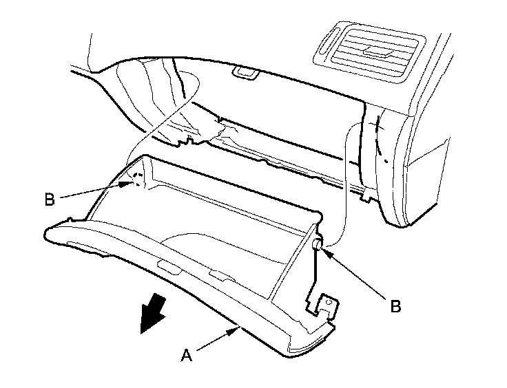 2. While holding the glove box (A), release the glove box stops (B) on each side of the dashboard by pushing them in, then remove the glove box.