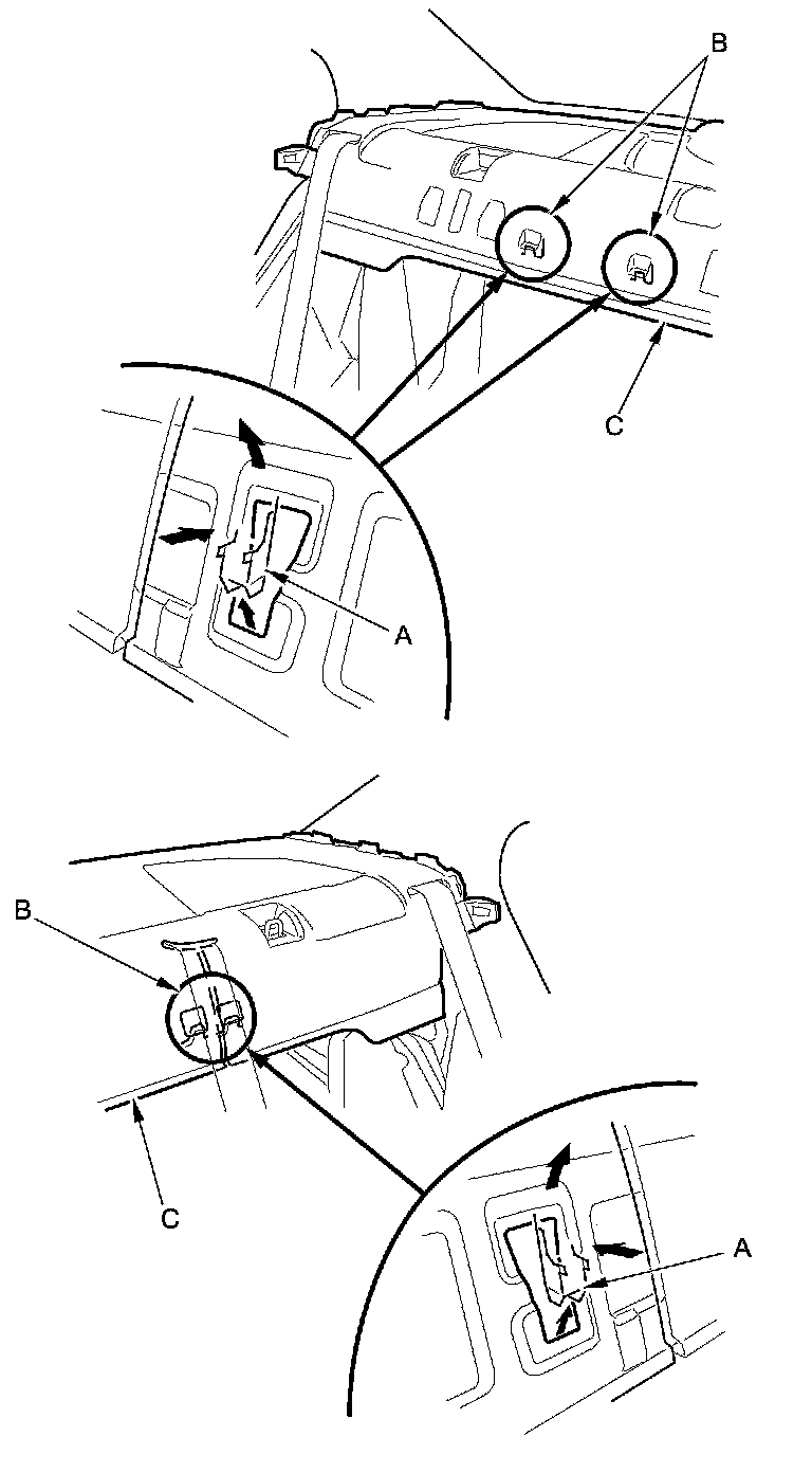 6. Lift the rear shelf (A) upward to detach the remaining clips. Except Si model: Release the hooks (B) of the high mount brake light from the rear shelf. Release the pin (C) from the hole on the body.