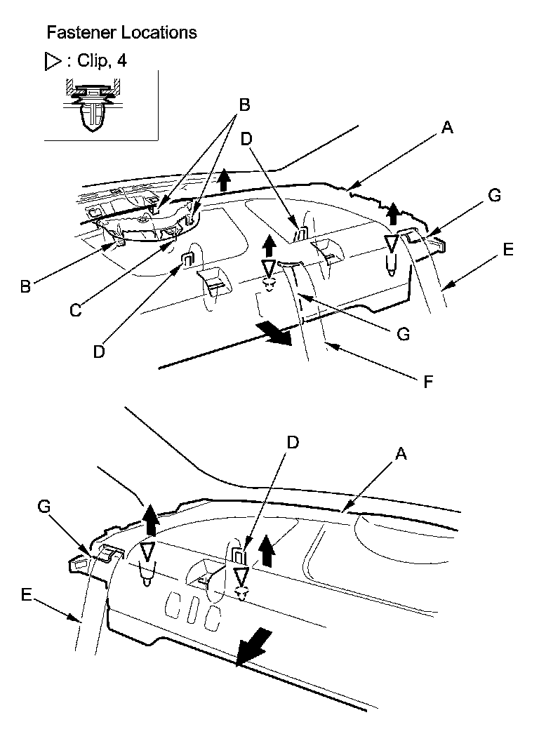 7. Release each tether anchor striker (D) out through the hole in the rear shelf, and pull out both rear seat belts (E) and the rear center seat belt (F) through the slits (G) in the rear shelf.