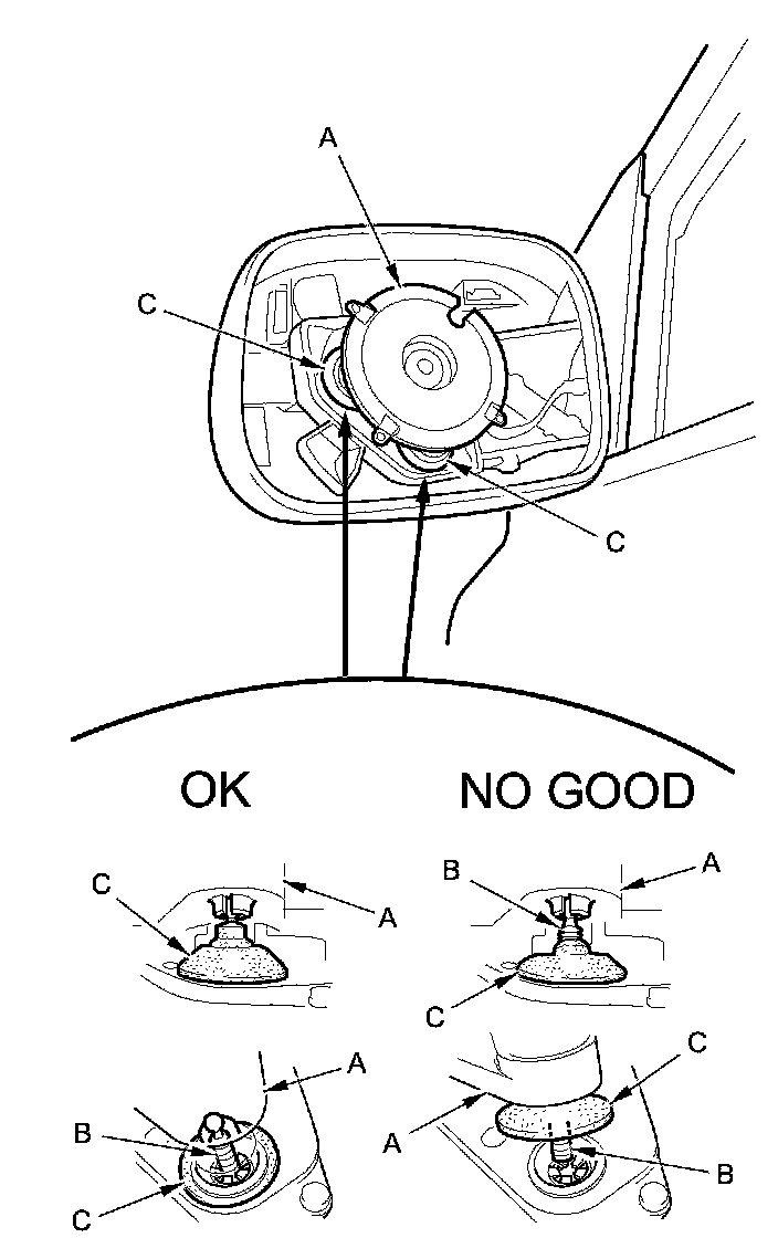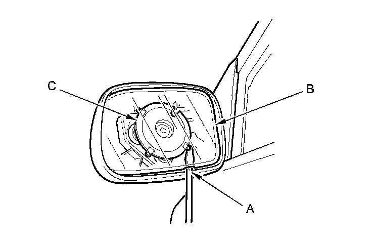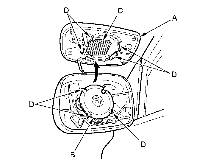 5. Separate the mirror holder (A) from the actuator (B) by slowly pulling the mirror apart while separating the adhesive (C), and release the hooks (D). If equipped, disconnect the mirror defogger connectors from the heater pad terminals.