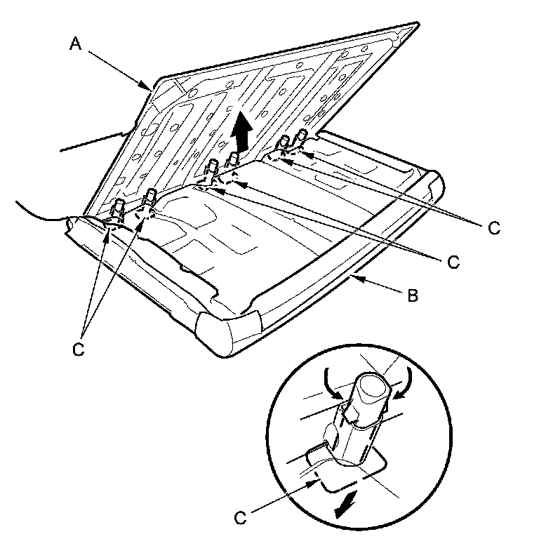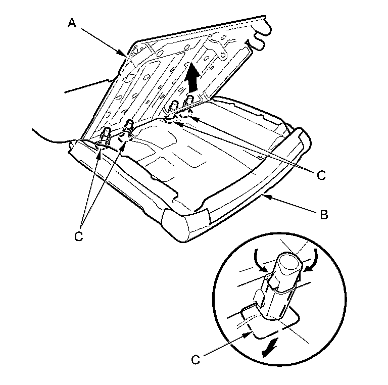 6. Pull out the seat-back frame (A) from the seat-back cover/pad (B), then remove the head restraint guides (C) while pinching the tabs on the ends of the guides.