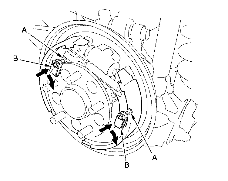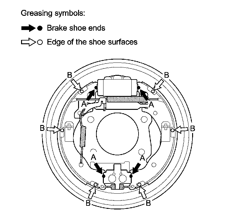 5. Apply a thin coat of Molykote 44MA grease to the shoe ends (A) and to the edge of the shoe surfaces (B) that make contact with the backing plate as shown. Wipe off any excess. Keep grease away from the brake linings.