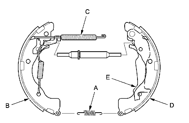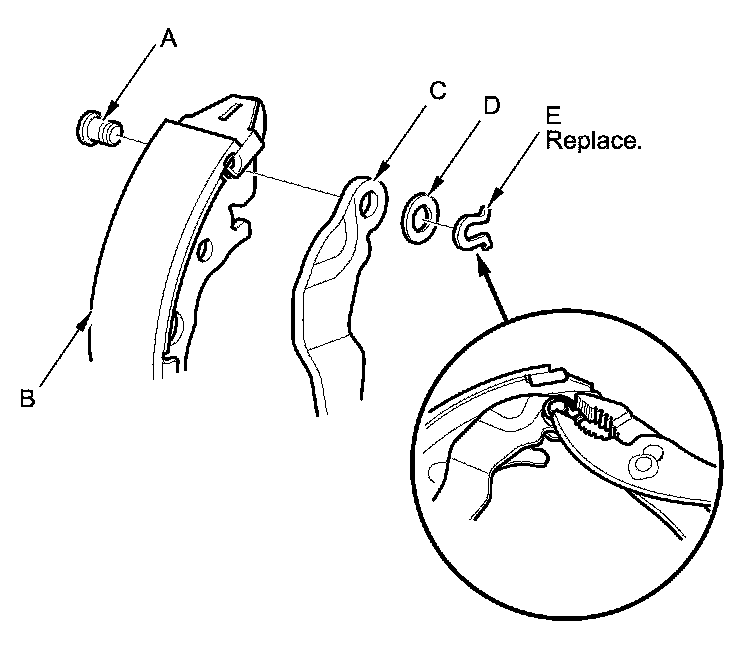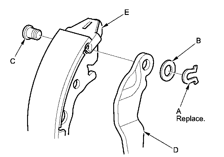 8. Remove the U-clip (A), the wave washer (B), and the pivot pin (C), and separate the parking brake lever (D) from the brake shoe (E).