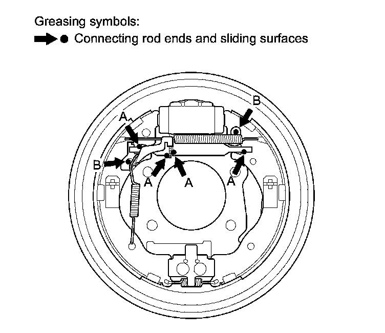4. Apply a thin coat of Molykote 44MA grease to the connecting rod ends (A), and the sliding surfaces (B) as shown. Wipe off any excess. Keep grease away from the brake linings.
