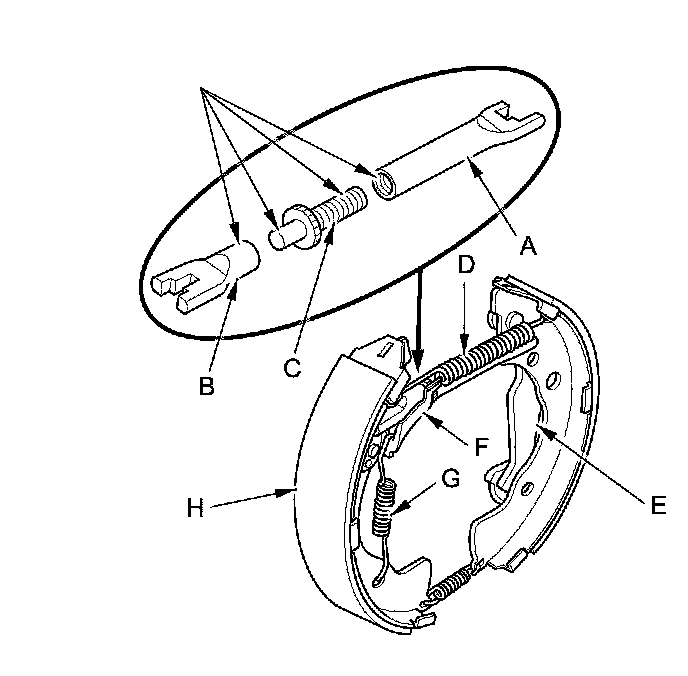 7. Assemble the brake shoes with the upper return spring (D), with the connecting rods and the adjuster bolt onto the backing plate. Reconnect the parking brake cable to the parking brake lever (E), then install the self-adjuster lever (F) and the self-adjuster spring (G) on the forward brake shoe (H).