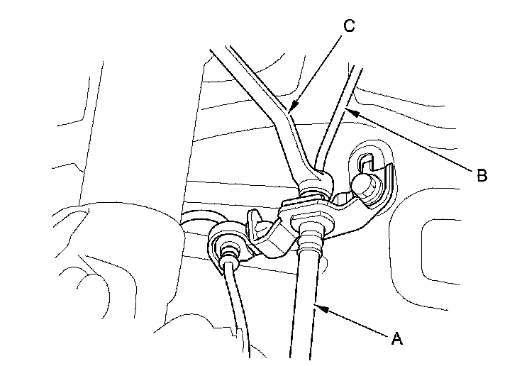 - With clip type: Install the brake hose on the brake hose bracket (B) with the new brake hose clip (C).