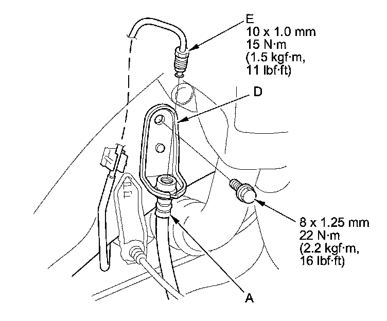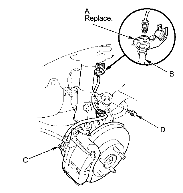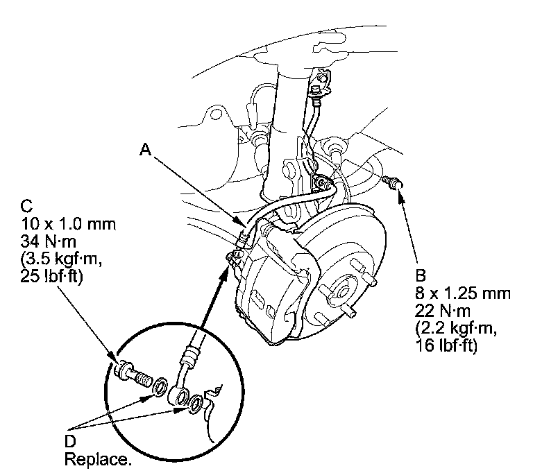 6. Remove the brake hose mounting bolt(s) (D), then remove the brake hose.