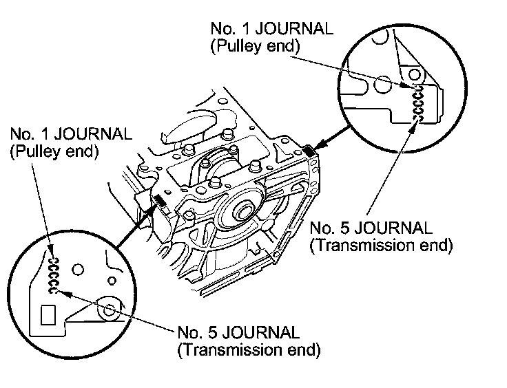 1. Numbers, letters, or bars have been stamped on either side of the lower block end as a code for the size of each of the five main journal bores. Write down the block bore codes.