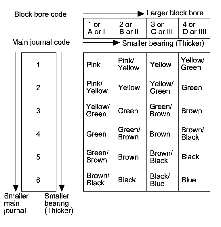 3. Use the block bore codes and the main journal codes to select the appropriate replacement bearings from the following table.