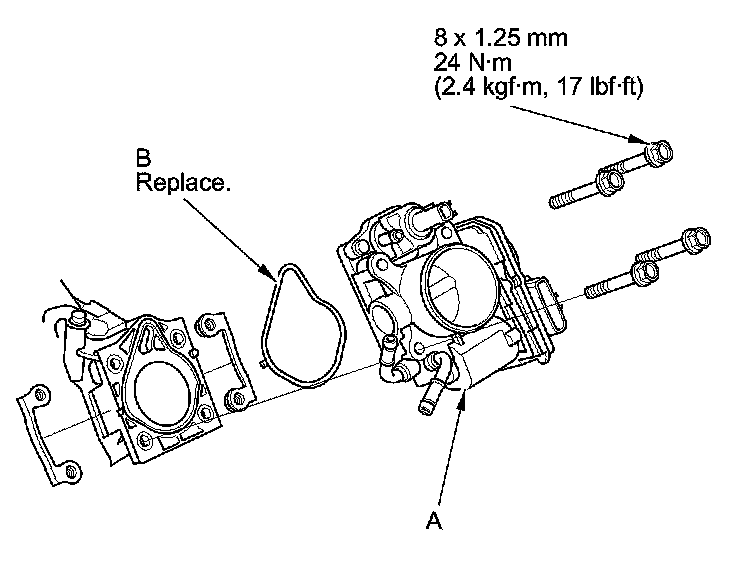 7. Install the throttle body (A) with a new gasket (B).