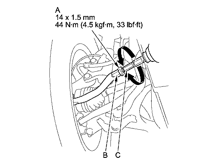 3. Loosen the tie-rod end locknuts (A) while holding the flat surface sections (B) of the tie-rod end with a wrench, and turn both tie-rods (C) until the front toe is within specifications.