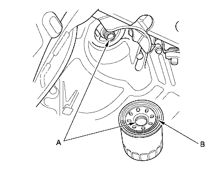 3. Inspect the threads (A) and the rubber seal (B) on the new filter. Clean the seat on the oil pan, then apply a light coat of new engine oil to the oil filter rubber seal. Use only filters with a built-in bypass system.