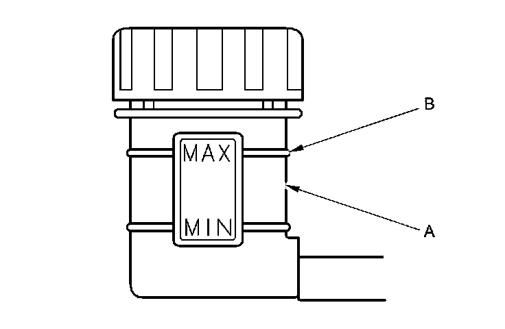 1. Make sure the brake fluid level in the clutch reservoir (A) is at the MAX (upper) level line (B).