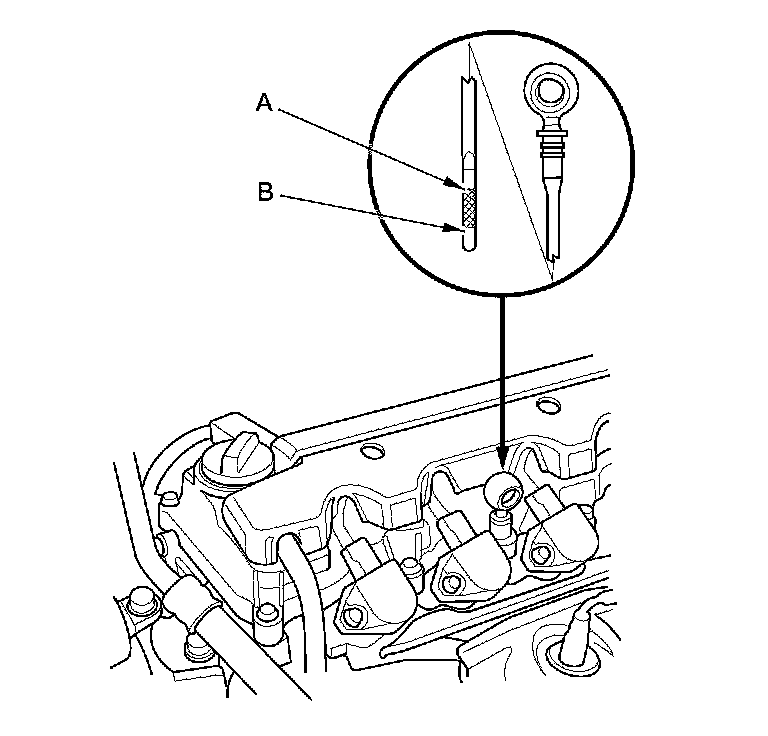 3. Remove the dipstick, and check the engine oil level. It should be between the upper mark (A) and the lower mark (B).