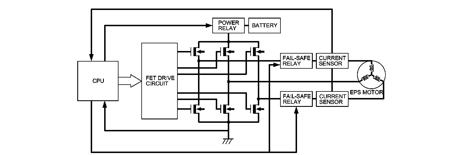 The EPS uses an efficient brushless DC type motor. The EPS motor control circuit is composed of a system control CPU, FET drive circuit, H type FET bridge, power relay, fail-safe relay, electric current sensor, and the EPS motor. From the input sensor signals, the CPU calculates and outputs the appropriate three-phase current for the FET drive circuit.