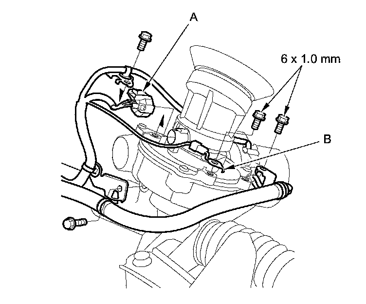 2. Disconnect the torque sensor 3P connector (A) from the steering gearbox, then remove the wire harness clamp bolts and the ground terminal (B).