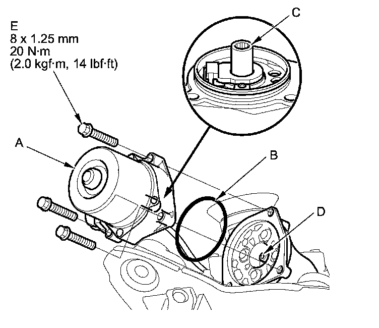 6. Loosely install the EPS motor mount bolts (E), then turn the steering wheel two or three times to the right and left about 45 degrees.