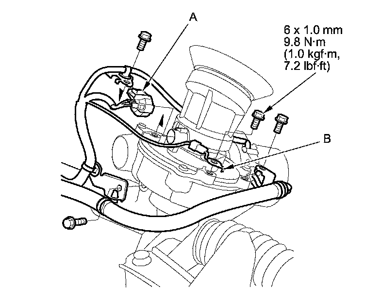 8. Connect the torque sensor 3P connector (A) to the steering gearbox, then install the wire harness clamp bolts and the ground terminal (B).