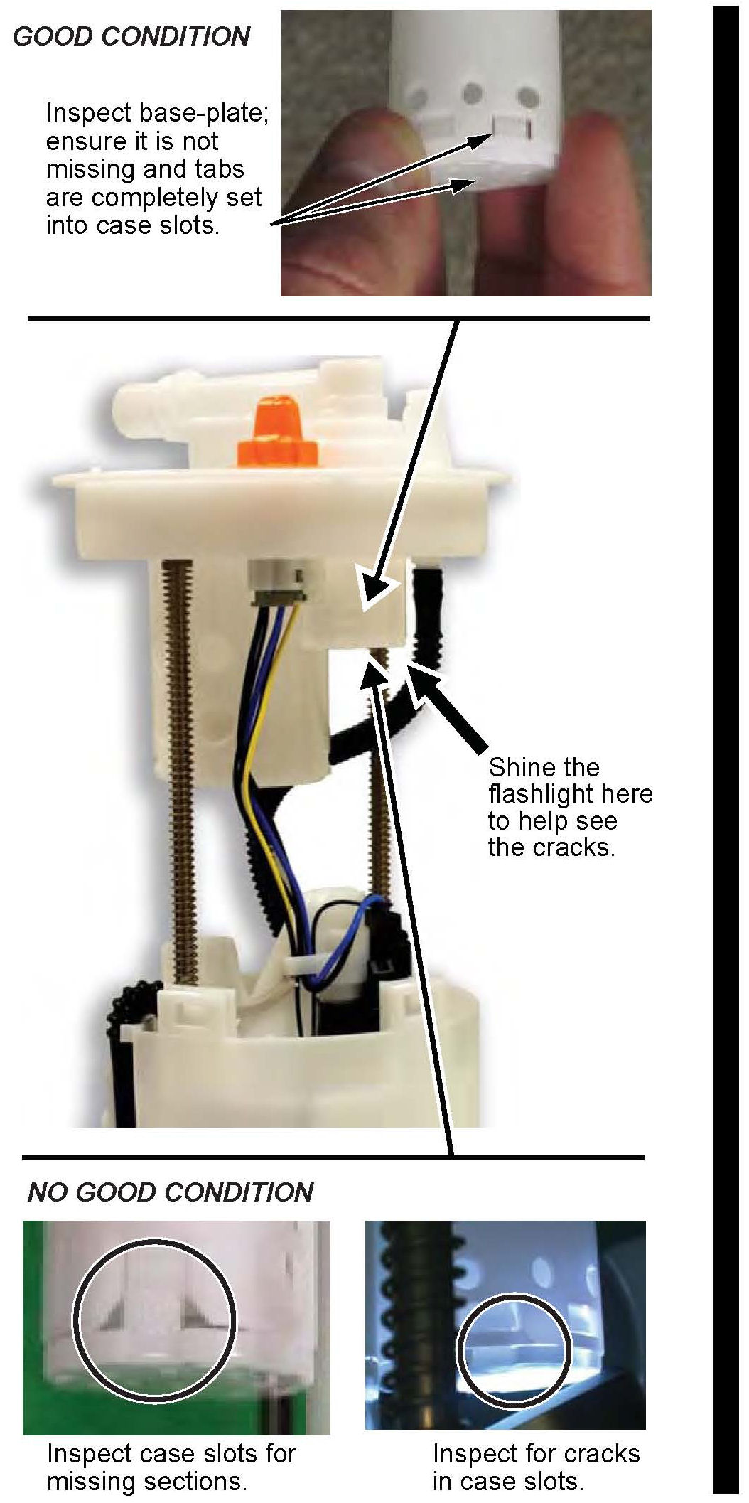 5. Using a flashlight, inspect the roll-over valve case for: