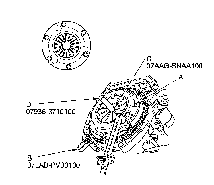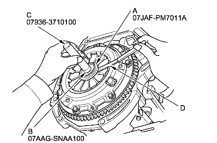 2. Check the evenness of the height of the diaphragm spring fingers using the clutch alignment disc (A), the clutch alignment shaft (B), the remover handle (C), and a feeler gauge (D). If the height difference is more than the service limit, replace the pressure plate.