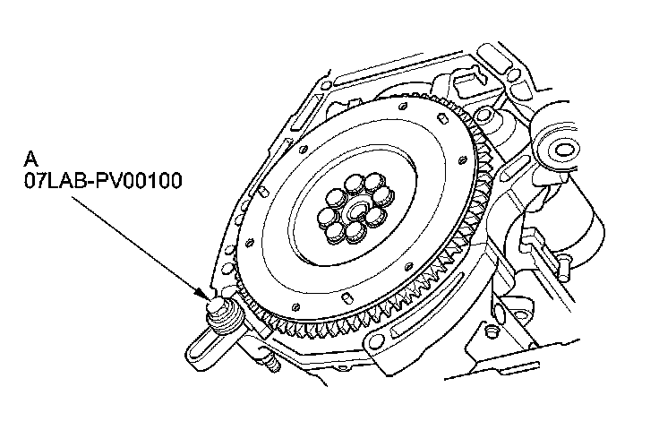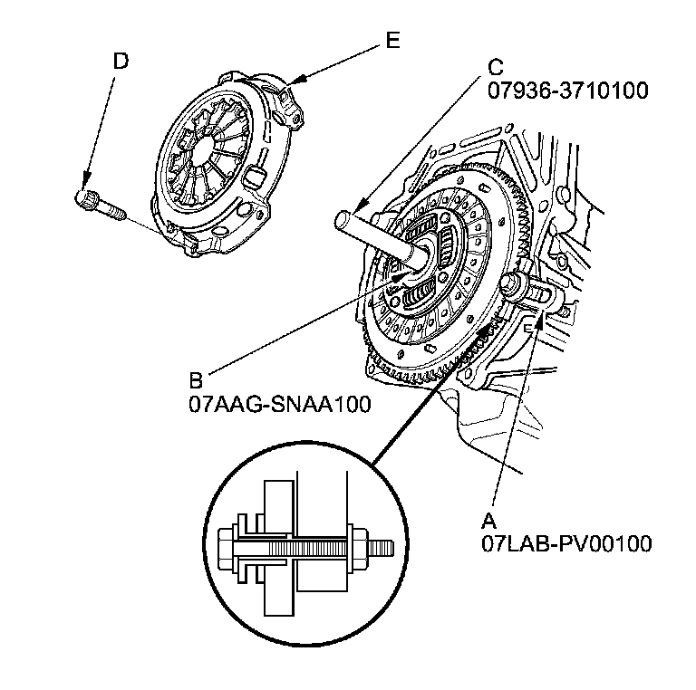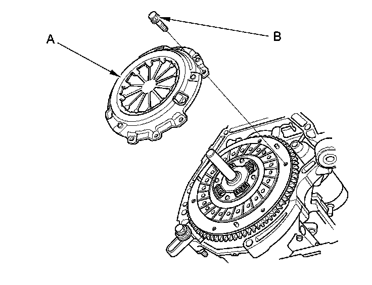 28. Torque the pressure plate mounting bolts (A) in a crisscross pattern. Tighten the bolts in several steps to prevent warping the diaphragm spring. Make sure that there is no clearance between the pressure plate and the flywheel.