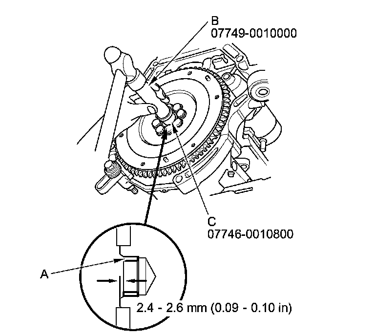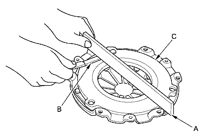 7. Inspect for warpage using a straight edge (A) and a feeler gauge (B). Measure across the pressure plate (C). If the most measurement difference is more than the service limit, replace the pressure plate.