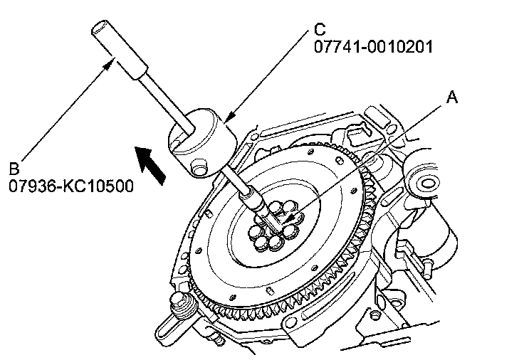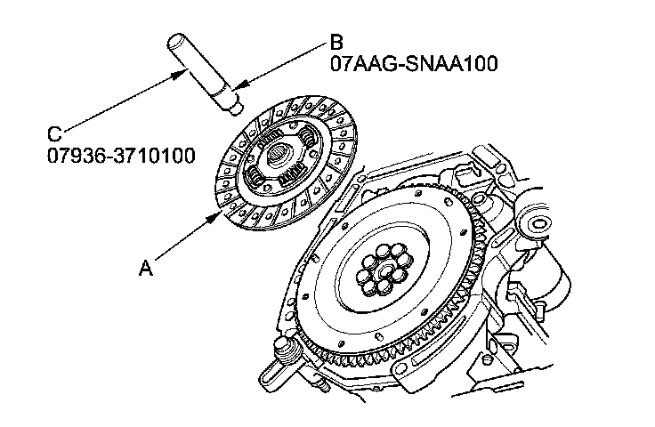 8. Remove the clutch disc (A), the clutch alignment shaft (B), and the remover handle (C).