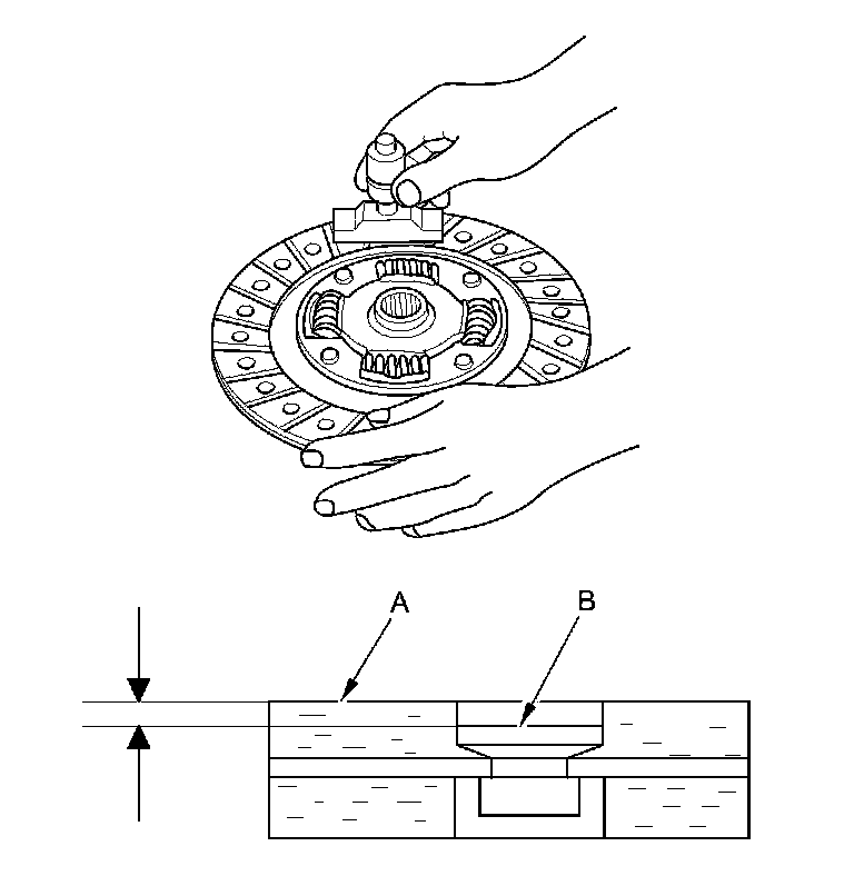 11. Measure the depths of the rivets from the clutch disc lining surface (A) to the rivets (B) on both sides. If the measurement is less than the service limit, replace the clutch disc.