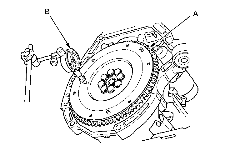 15. Measure the flywheel (A) runout using a dial indicator (B). Through at least two full turns with pushing against the flywheel each time you turn it to take up the crankshaft thrust washer clearance. If the measurement is more than the service limit, replace the flywheel, and recheck the runout; go to step 16.