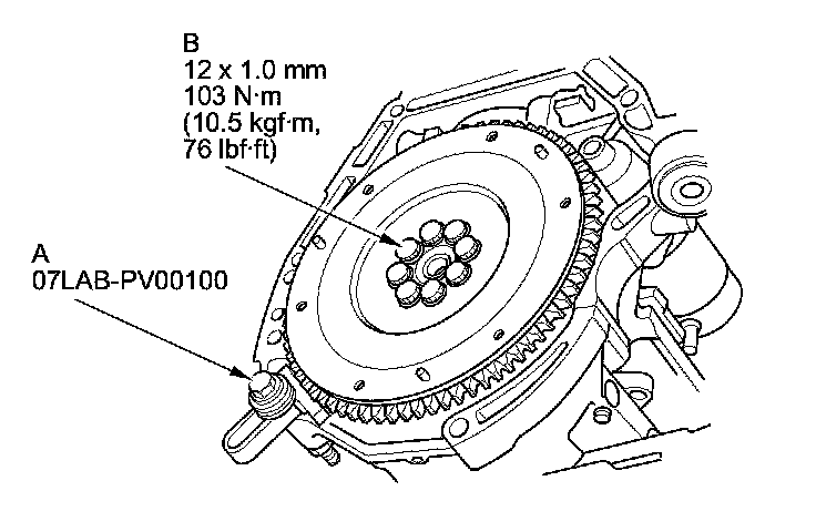 19. Install the ring gear holder (A), then tighten the flywheel mounting bolts (B) in a crisscross pattern in several steps.