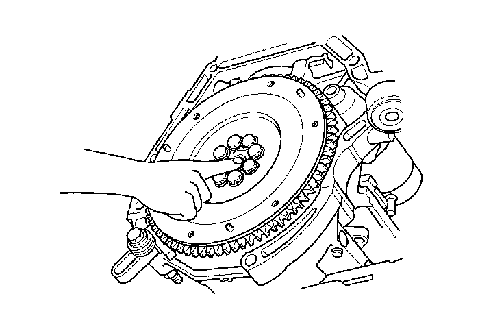 17. Loosen the flywheel mounting bolts in a crisscross pattern in several steps. Remove the bolts, then remove the flywheel and the ring gear holder.