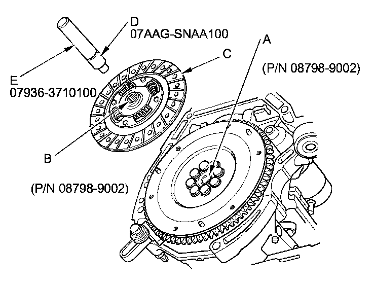 26. Apply super high temp urea grease (P/N 08798-9002) to the splines (B) of the clutch disc (C), then install the clutch disc using the clutch alignment shaft (D), and the remover handle (E).