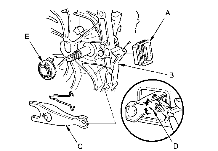 3. Remove the release fork (C) from the clutch housing by squeezing the release fork set spring (D) with pliers. Remove the release bearing (E).