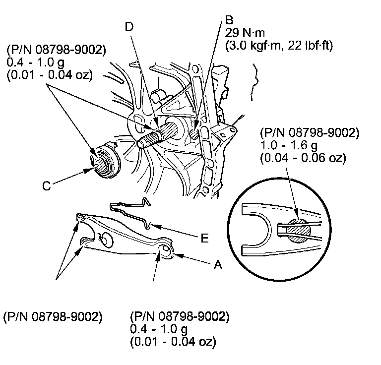 5. Apply super high temp urea grease (P/N 08798-9002) to the release fork (A), the release fork bolt (B), the release bearing (C), and the release bearing guide (D) in the shaded areas, then set the release fork set spring (E).