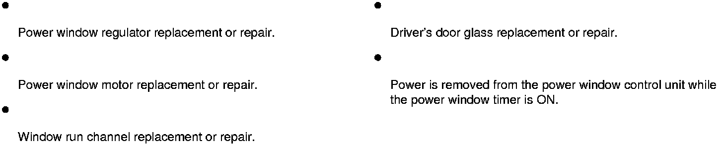 13. Confirm that the power window control unit is reset by using the driver's window AUTO UP and AUTO DOWN functions. If the window still does not work in AUTO, repeat the procedure several times, paying close attention to the 5 second time limit between steps. If it still does not work, refer to the master switch input test: