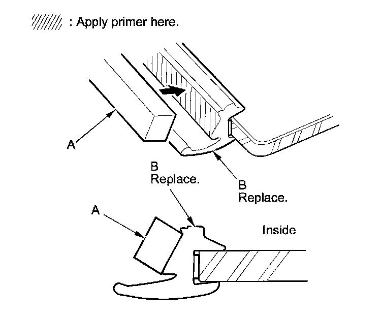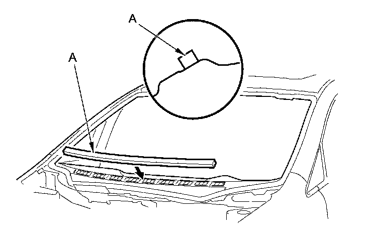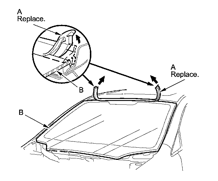 2. Remove the windshield molding (A) from the upper edge of the windshield (B). If necessary, cut the windshield molding with a utility knife.