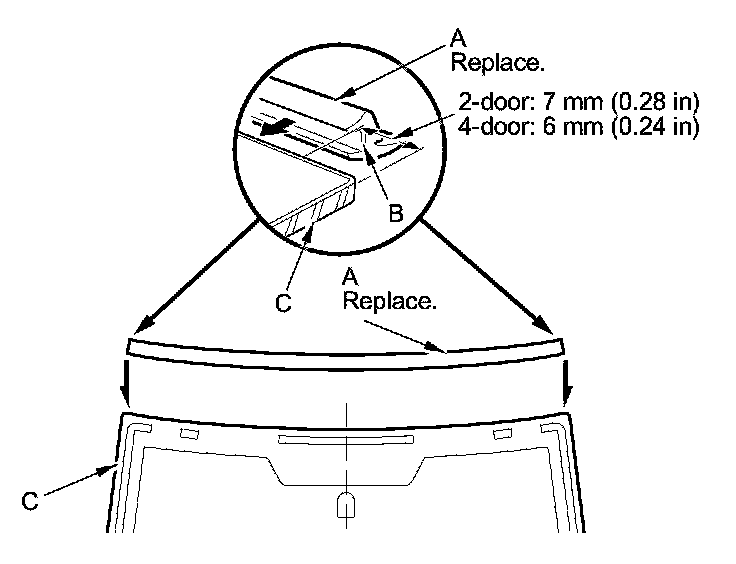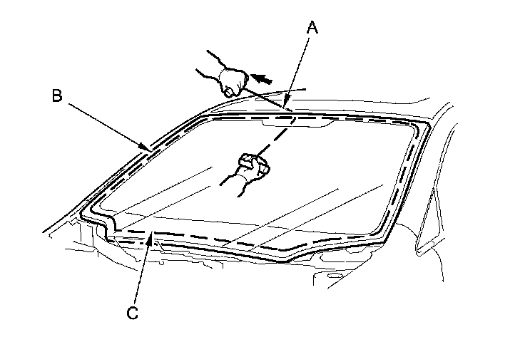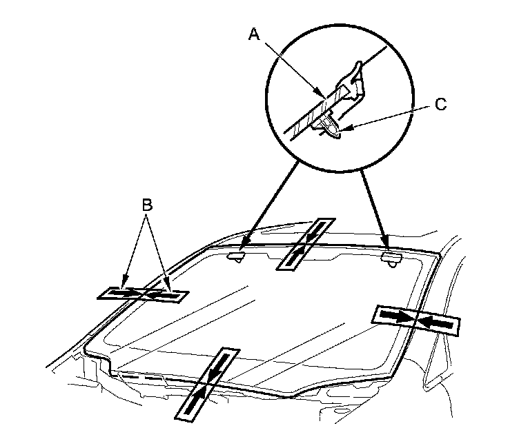 12. Attach the windshield molding (A) with adhesive tape (B) to the upper edge of the windshield (C). Be careful not to touch the windshield where the adhesive will be applied.
