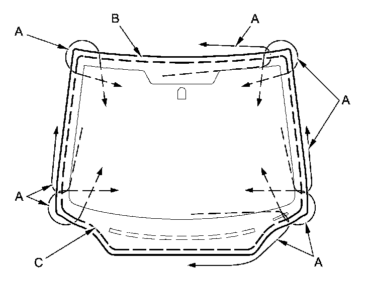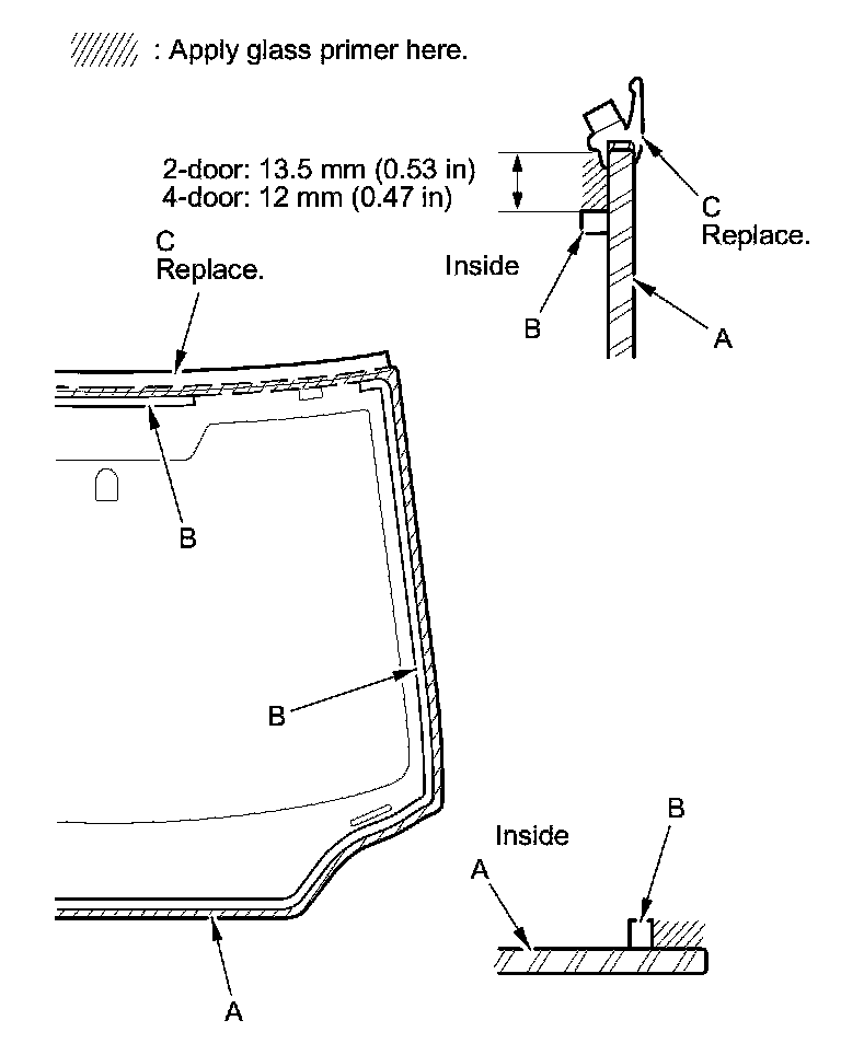 17. Apply a light coat of glass primer along the edge of the windshield (A) between the rubber dams (B) or the windshield molding (C) as shown, then lightly wipe it off with gauze or cheesecloth: