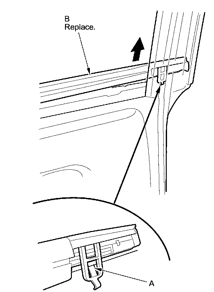2. Release the front hook (A) with a flat-tip screwdriver from inside of the door, then pull up the front area of the rear door glass outer weatherstrip (B).