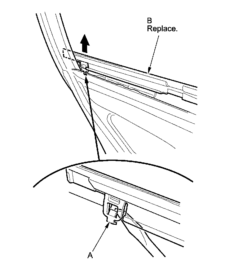 4. Release the rear hook (A) with a flat-tip screwdriver from inside of the door, then remove the rear door glass outer weatherstrip (B).