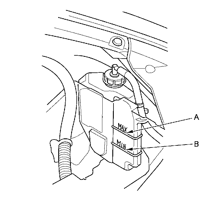 1. Check at the coolant level in the coolant reservoir. Make sure it is between the MAX mark (A) and the MIN mark (B).