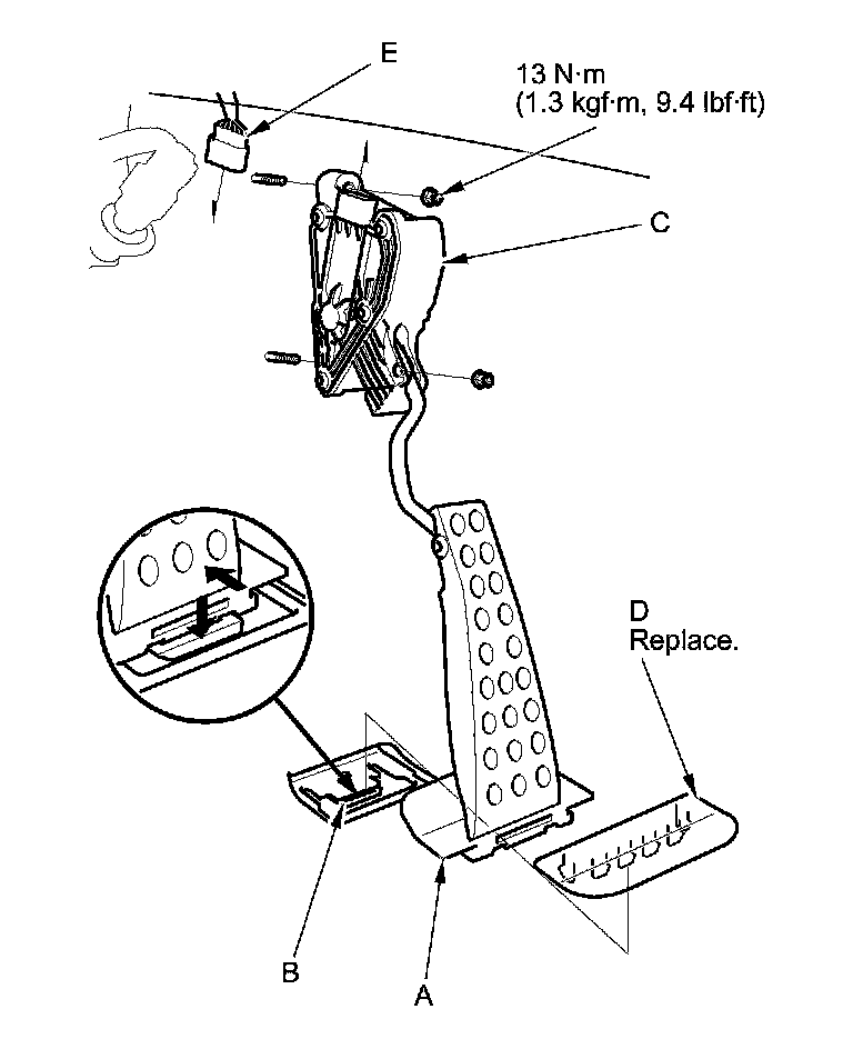 3. Push the tab (C), and remove the accelerator pedal pad (D) from the pedal stop (E).
