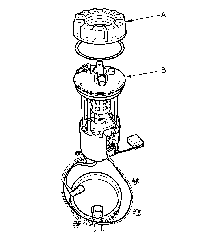 8. Remove the locknut (A) and the fuel tank unit (B).
