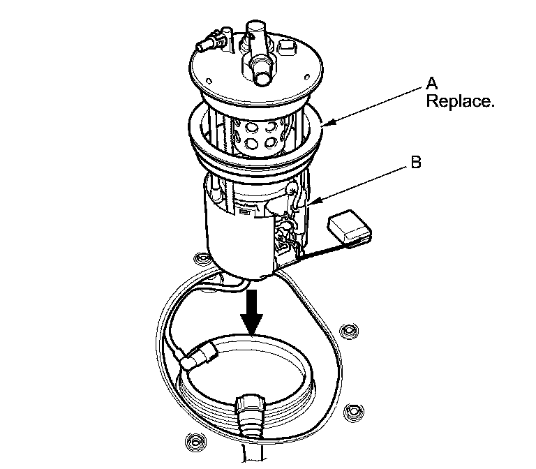1. Temporarily attach a new base gasket (A) to the fuel tank unit (B), then insert the fuel tank unit partially into the fuel tank.